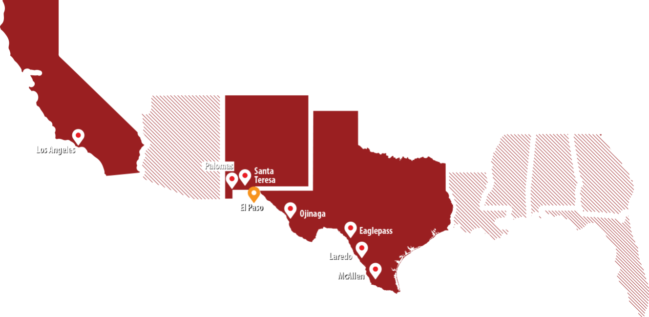 Laredo, McAllen, Eagle Pass. Con las ciudades fronterizas de los estados mexicanos de Coahuila, Nuevo León y Tamaulipas. También tenemos un almacén en el puerto de Los Ángeles, California. Nos especializamos en el manejo de mercancías In Bond en cualquier puerto de los Estados Unidos.